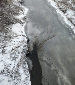A musím zmínit ještě jedno plus plovacích blan. Nejsou jen přínosem při obratném a rychlém plavání, ale umožňují kachnám pohodlně chodit i všude tam, kde by se leckdo bořil. V blátě i ve sněhu. A navíc jim není zima! Plavou si v pohodě i na skoro zamrzlém potoce, a když je zamrzlo moc, hup na led a přeběhnout. Viz foto.
